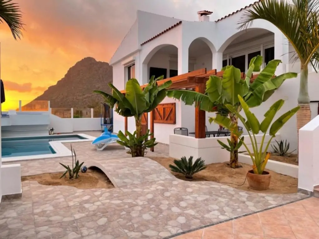 PalmBeech properties are proud to present this renovated Ibiza style house in La Florida. The property is located in the upper part of La Florida, surrounded by well-kept residential houses in a quiet yet central location. On a plot of 655m2, Villa Lorenzo has a unique pool area including a water terrace with stunning views overlooking Los Cristianos. The main house which is approximately 125m2 consists of a spacious and open plan living room, a separate kitchen, a dining room, two bedrooms and two bathrooms, as well as a laundry room.
