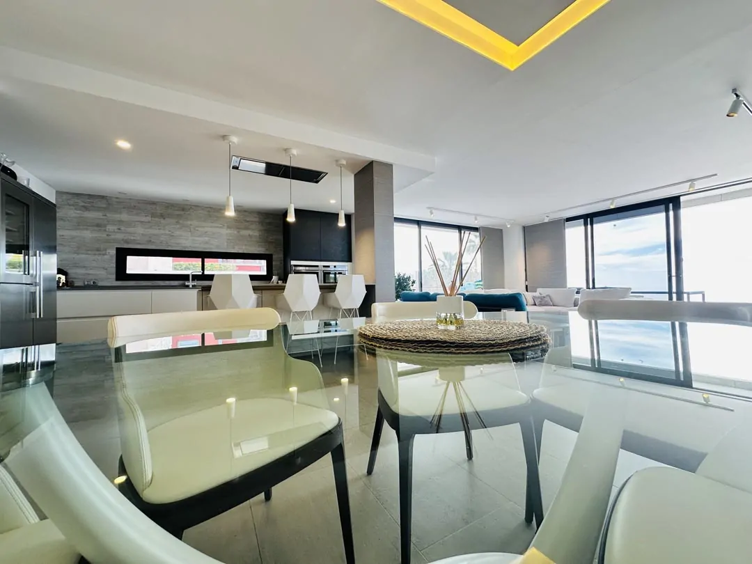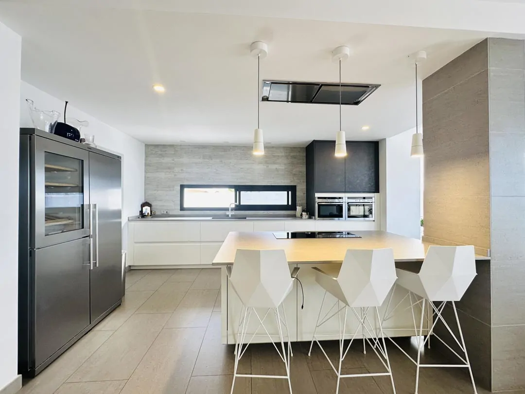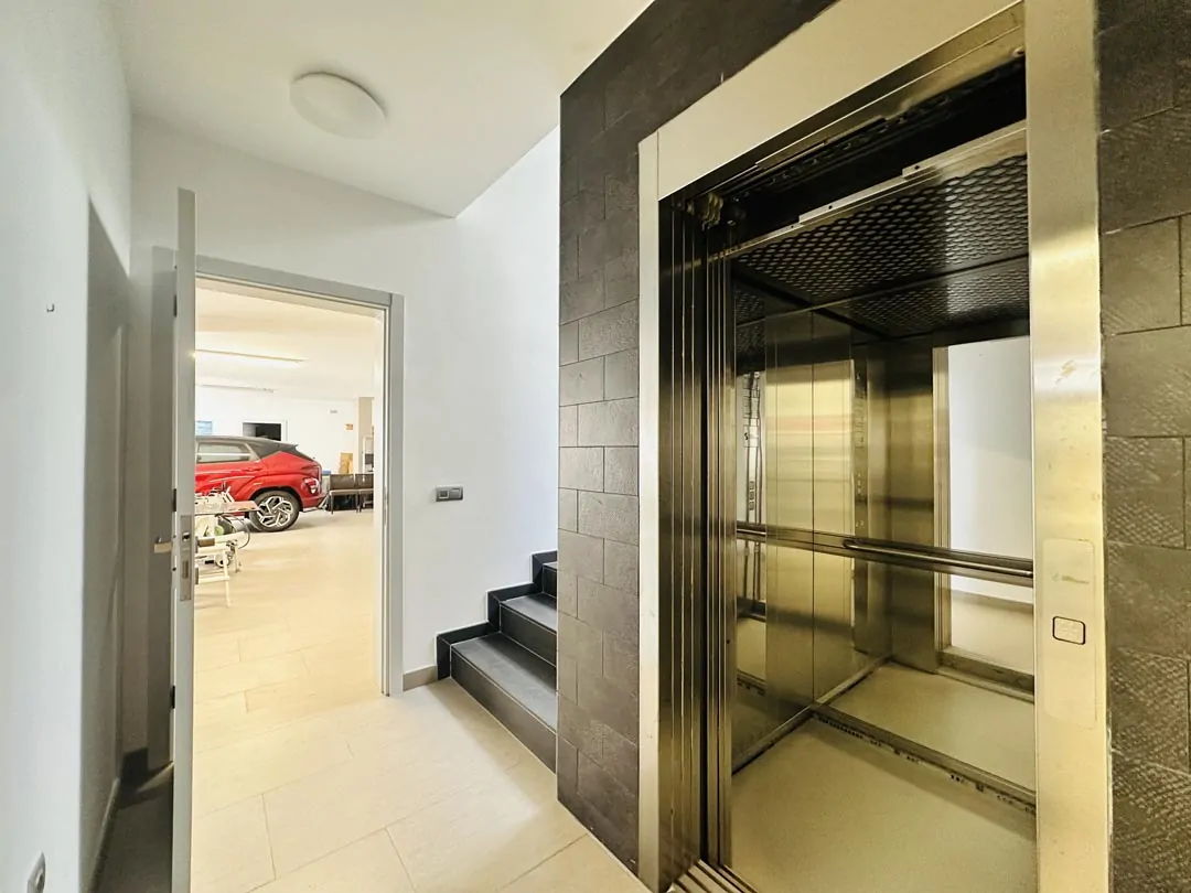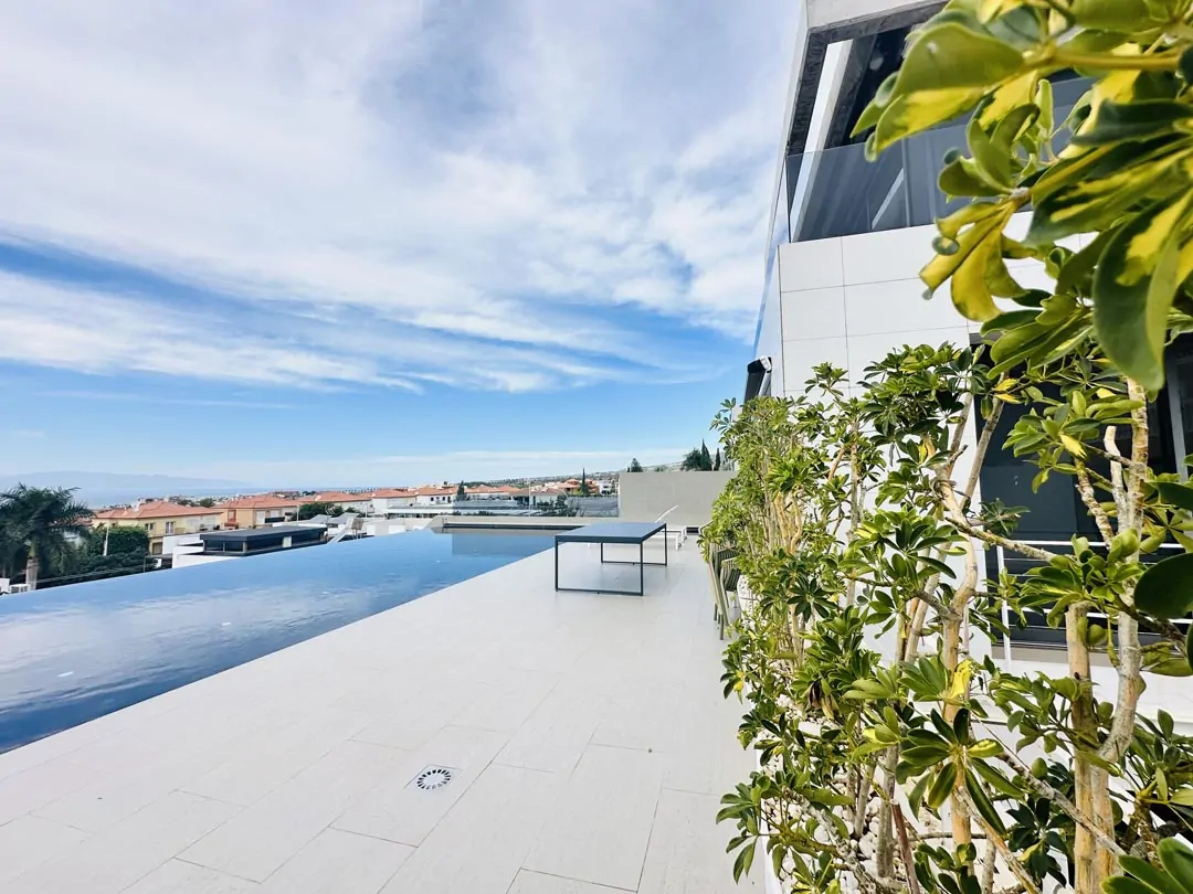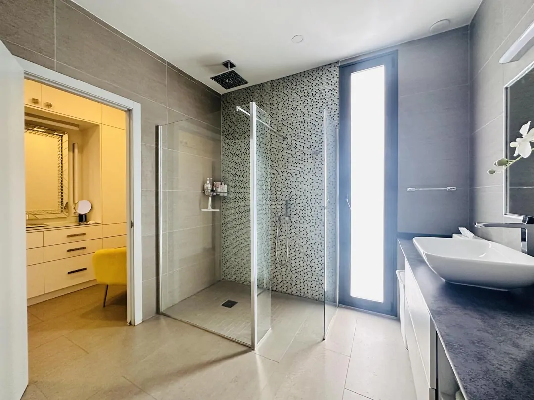 The main floor includes an open-plan kitchen, living and dining area that flows onto a panoramic terrace with a heated infinity pool. This level also includes a guest bedroom with garden access, a storage room and a guest WC.