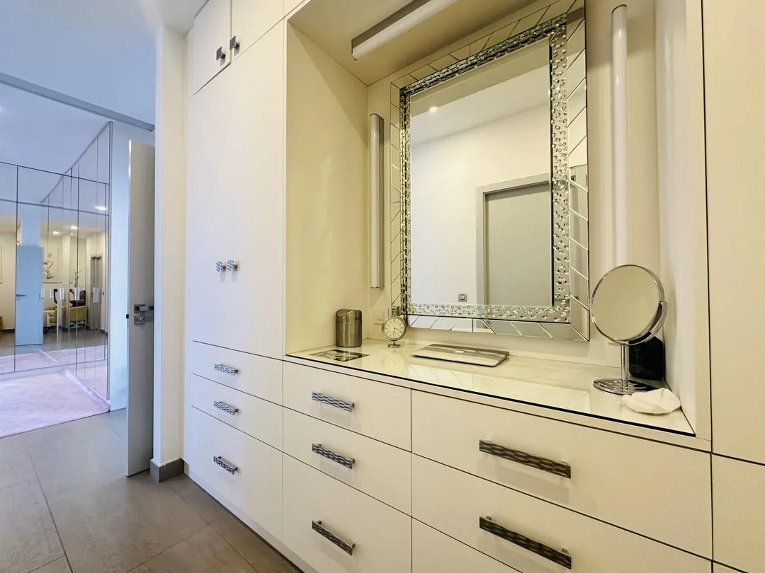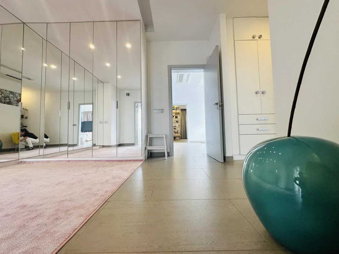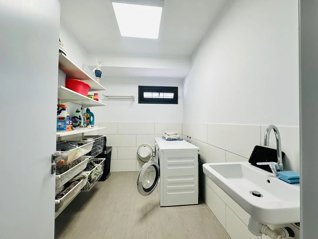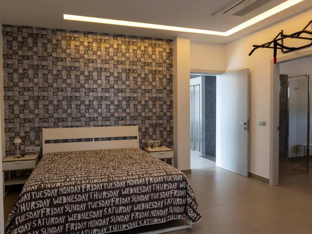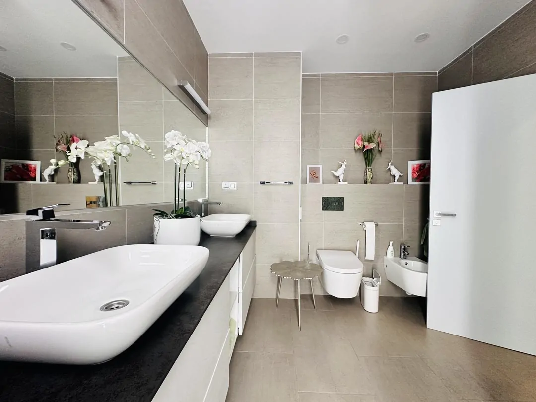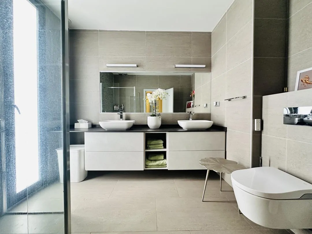 The main floor includes an open-plan kitchen, living and dining area that flows onto a panoramic terrace with a heated infinity pool. This level also includes a guest bedroom with garden access, a storage room and a guest WC.