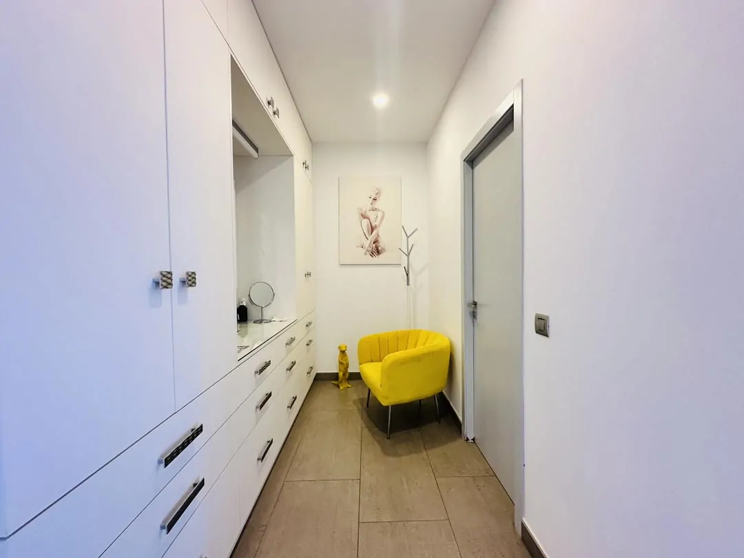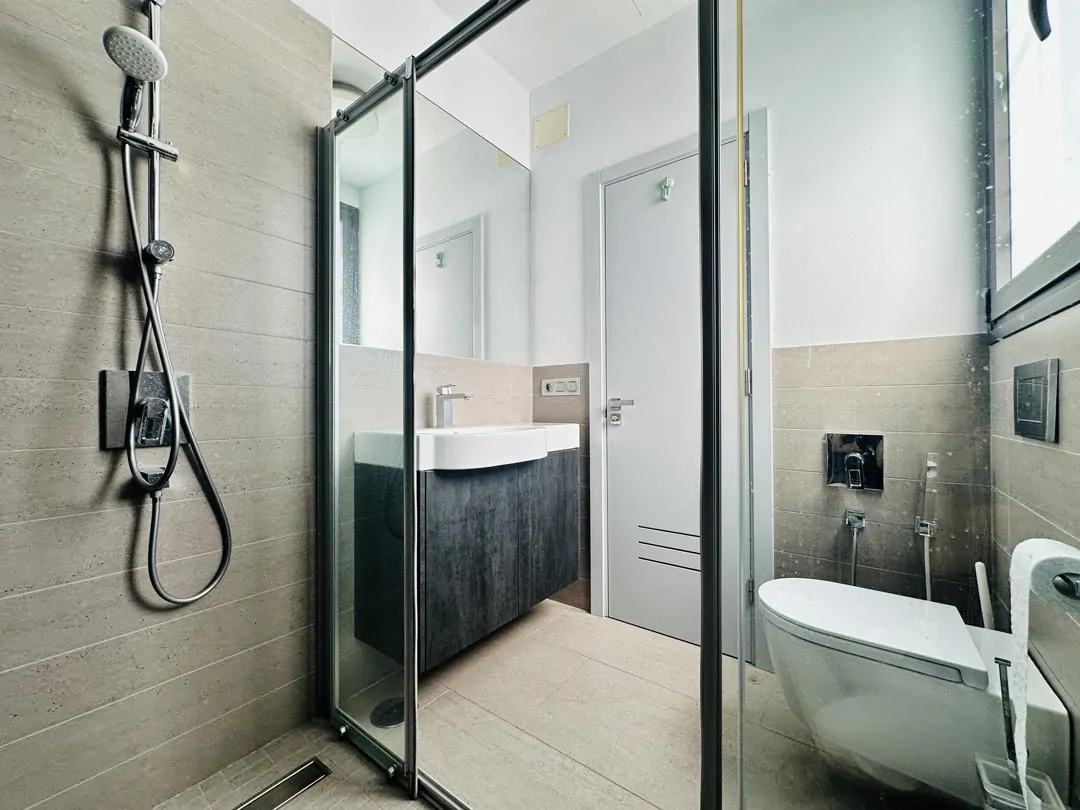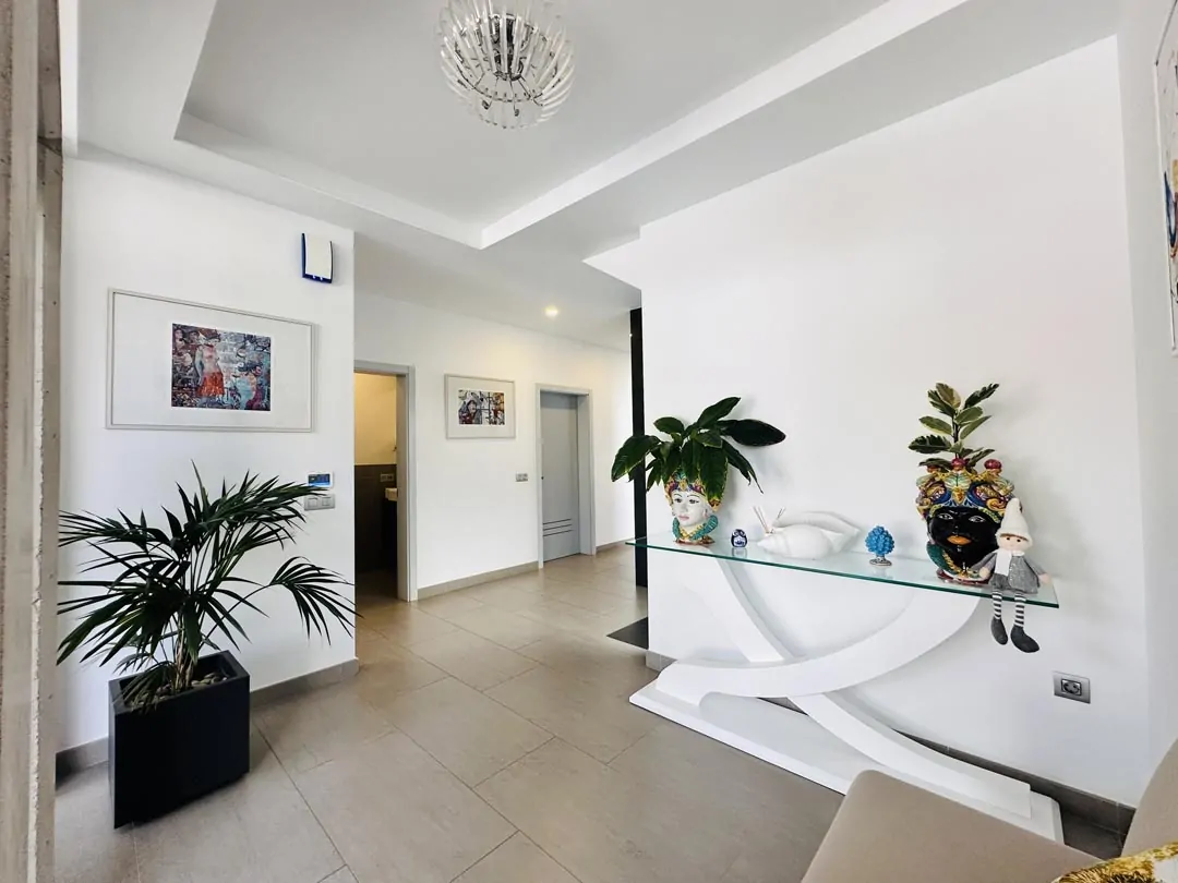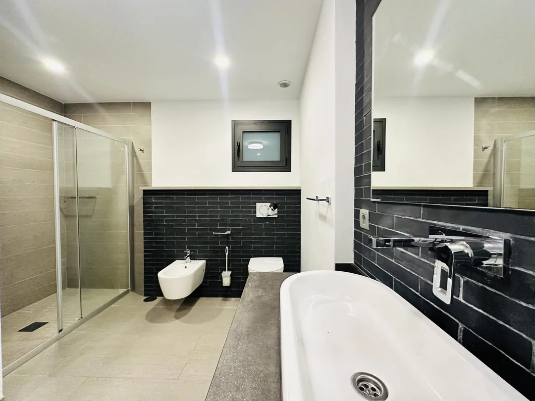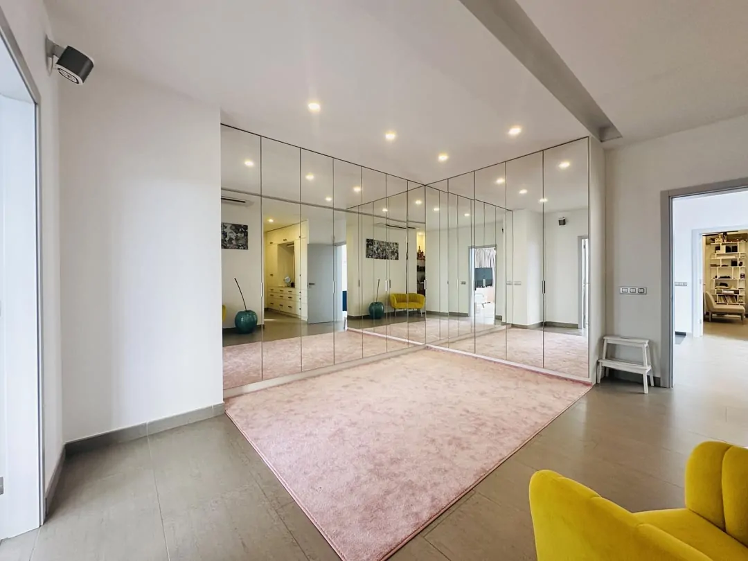 The main floor includes an open-plan kitchen, living and dining area that flows onto a panoramic terrace with a heated infinity pool. This level also includes a guest bedroom with garden access, a storage room and a guest WC.